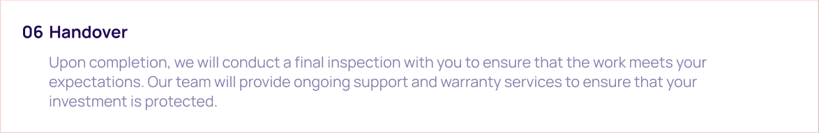Upon completion, we will conduct a final inspection with you to ensure that the work meets your expectations. Our team will provide ongoing support and warranty services to ensure that your investment is protected.