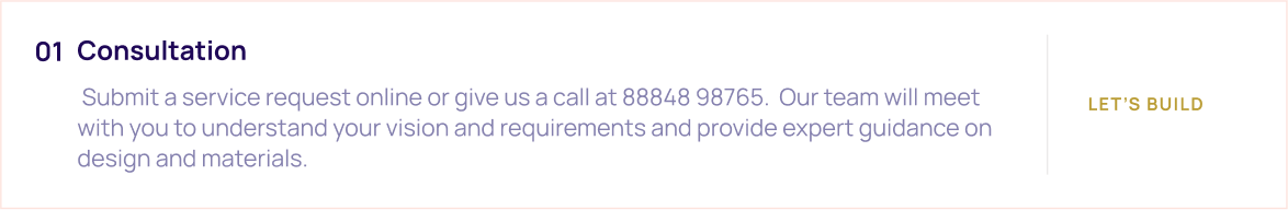 Submit a service request online or give us a call at 88848 98765. Our team will meet with you to understand your vision and requirements and provide expert guidance on design and materials.